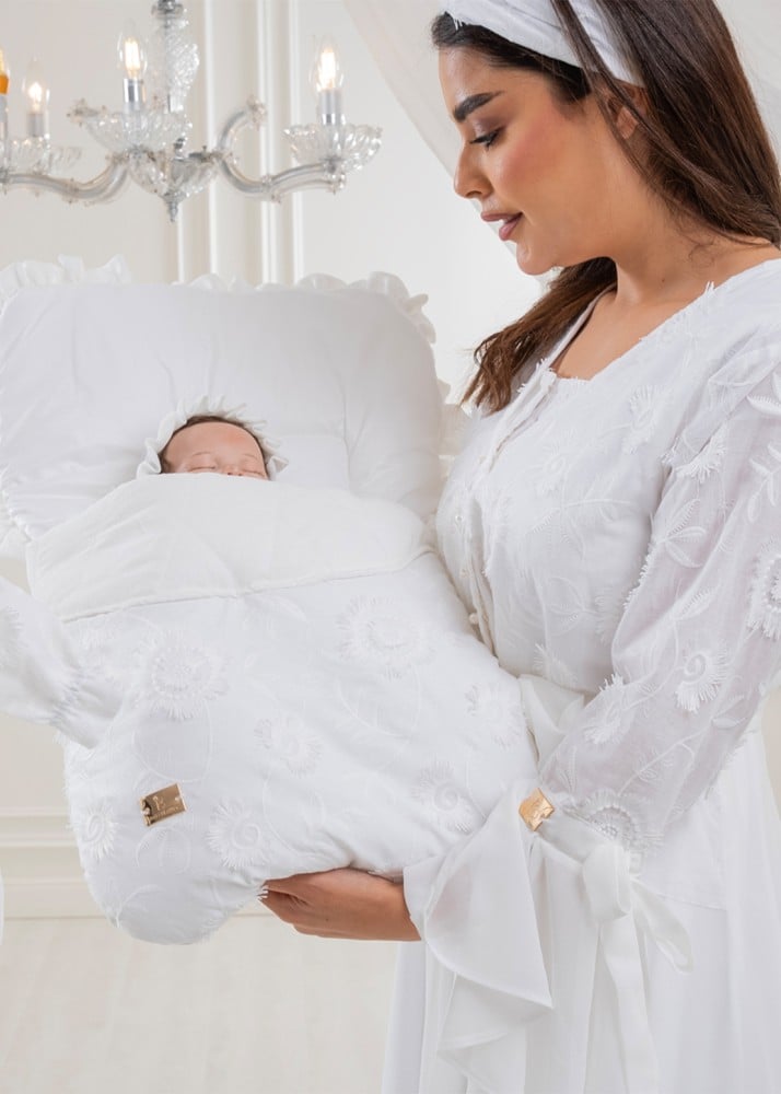 بكج الاستقبال الممميز بالركامة الأنيقة ( لبس الأم + المدس + لبس البيبي )