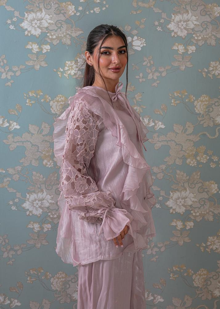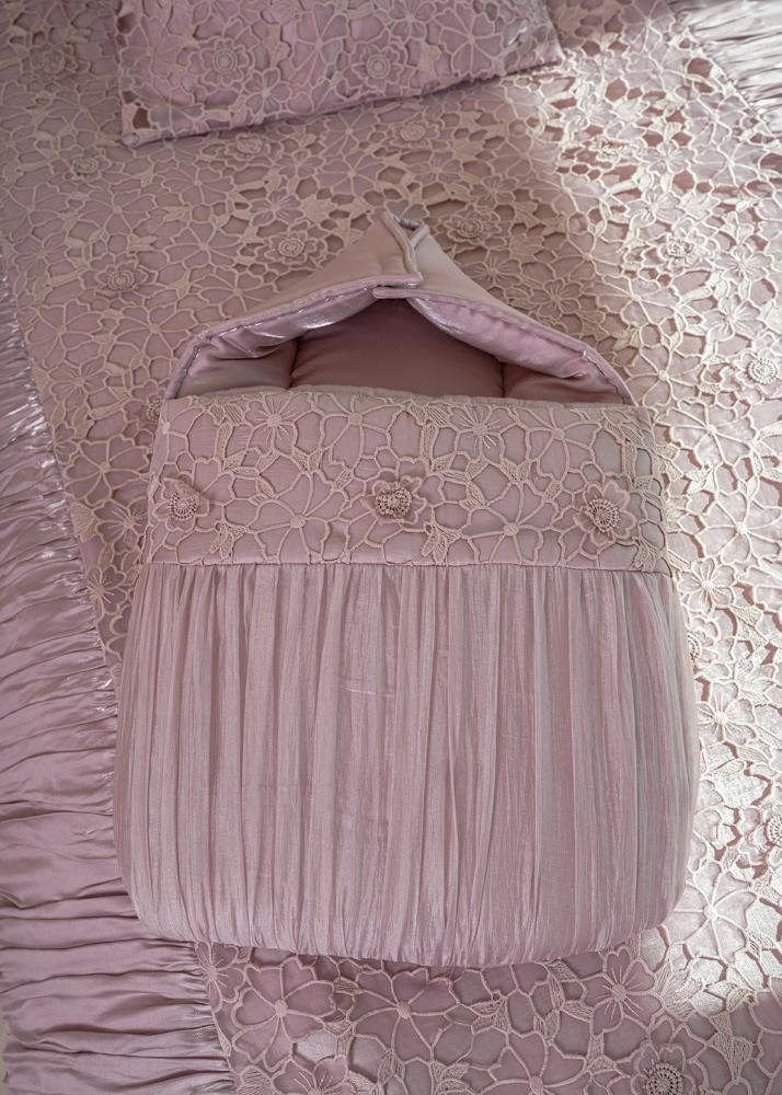 صُمم هذا الطقم ليروي تفاصيل أنوثة ملكية، بلون ناعم يحمل طابعًا دافئًا ومترفًا في آنٍ معًا. أما الدانتيل، فقد جاء بتفاصيل بارزة وبنقشة وردية أنيقة تغمر الأكمام وحواف السرير والمهد وفي جميع تفاصيل طقم الاستقبال ، ليمنح التصميم بُعدًا بصريًا ساحرًا لا يُقاوم.
