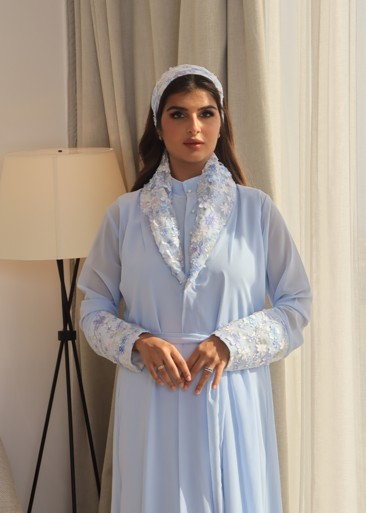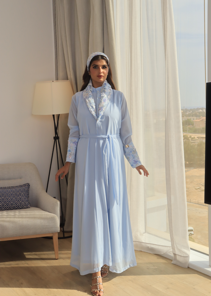 روب استقبال فاخر ومميز باللون السماوي يتكون من ( روب خارجي + بطانه داخليه + ربطه شعر ) , وتتميز هذي القطعه بخامتها البارده والجميله مما يجعلها خيارا مثاليا لكل ايام الأستقبال .