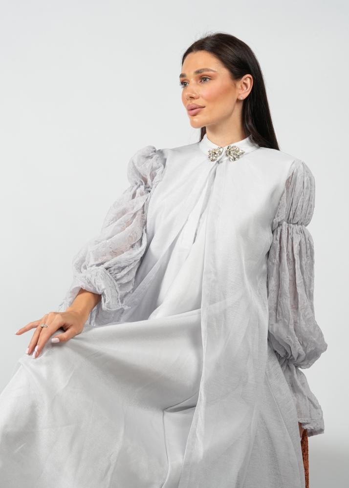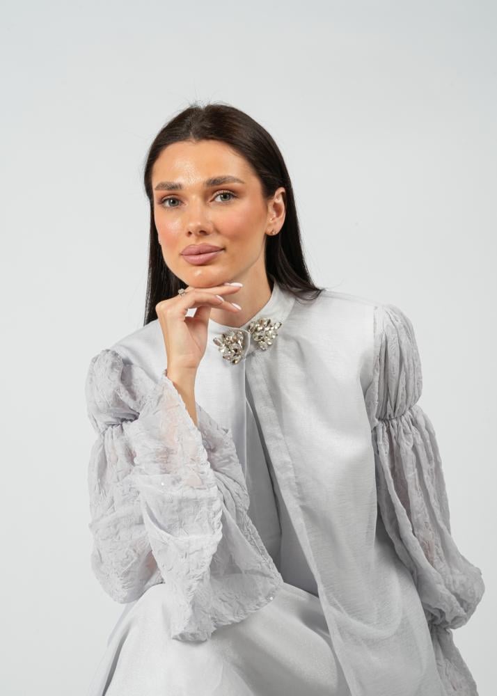 روب استقبال فاخر بتصميم راقي من قطعتين بخامة مميزة مع اضافة الكريستال الفخم ولمسة القماش المورد في التصميم أضاف نعومة واناقة ..من اللون الرمادي الفاتح جدا أنيق الطاللة استقبال مميزة