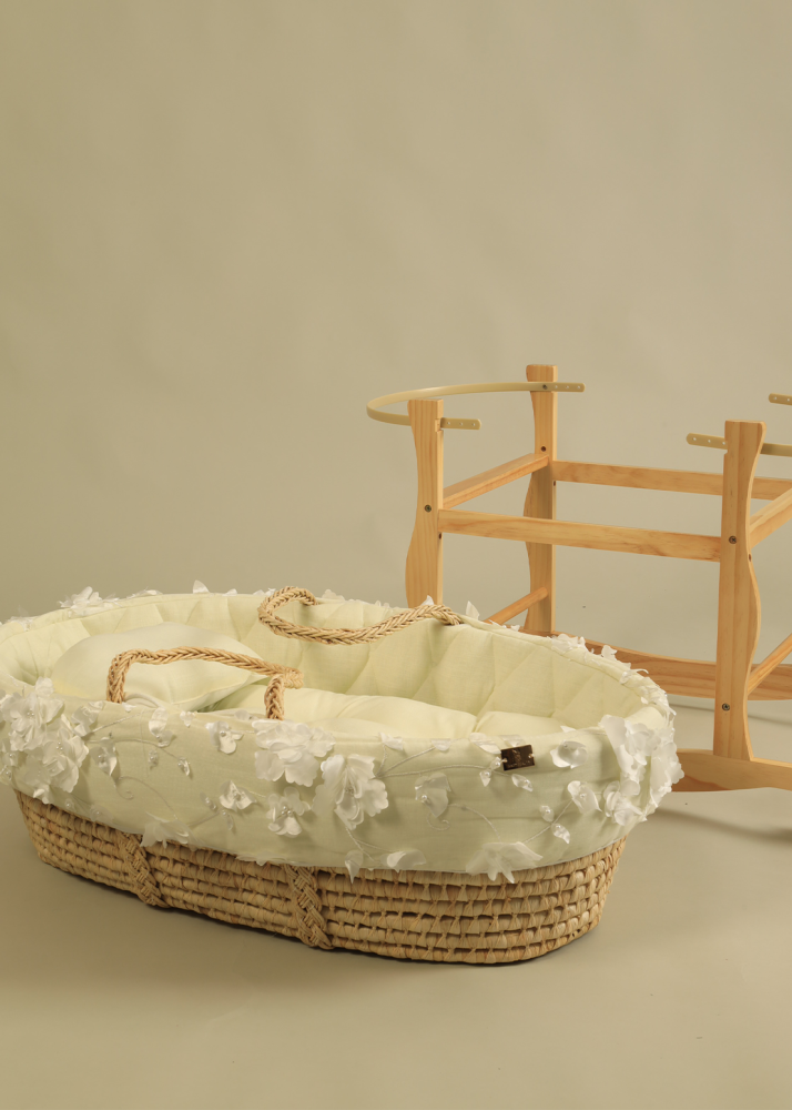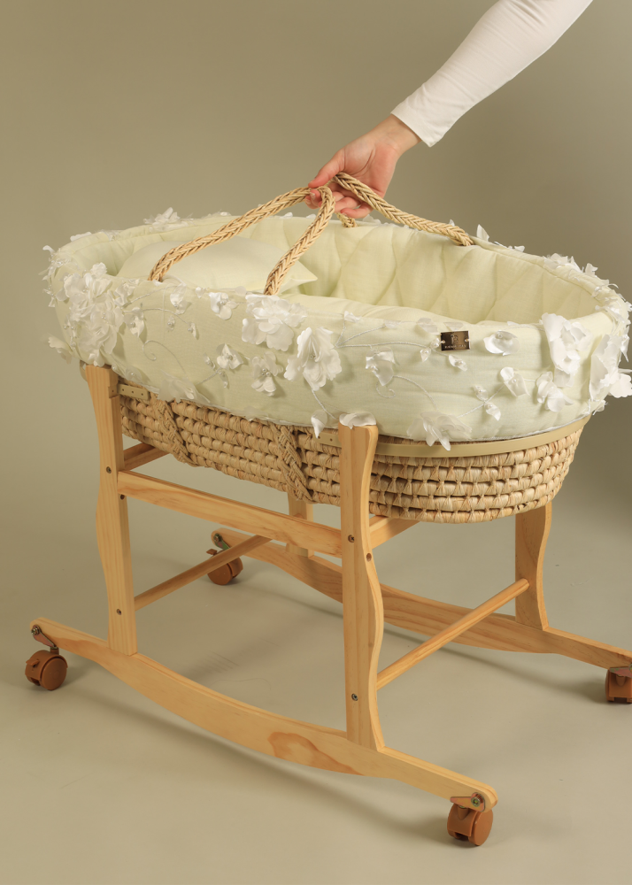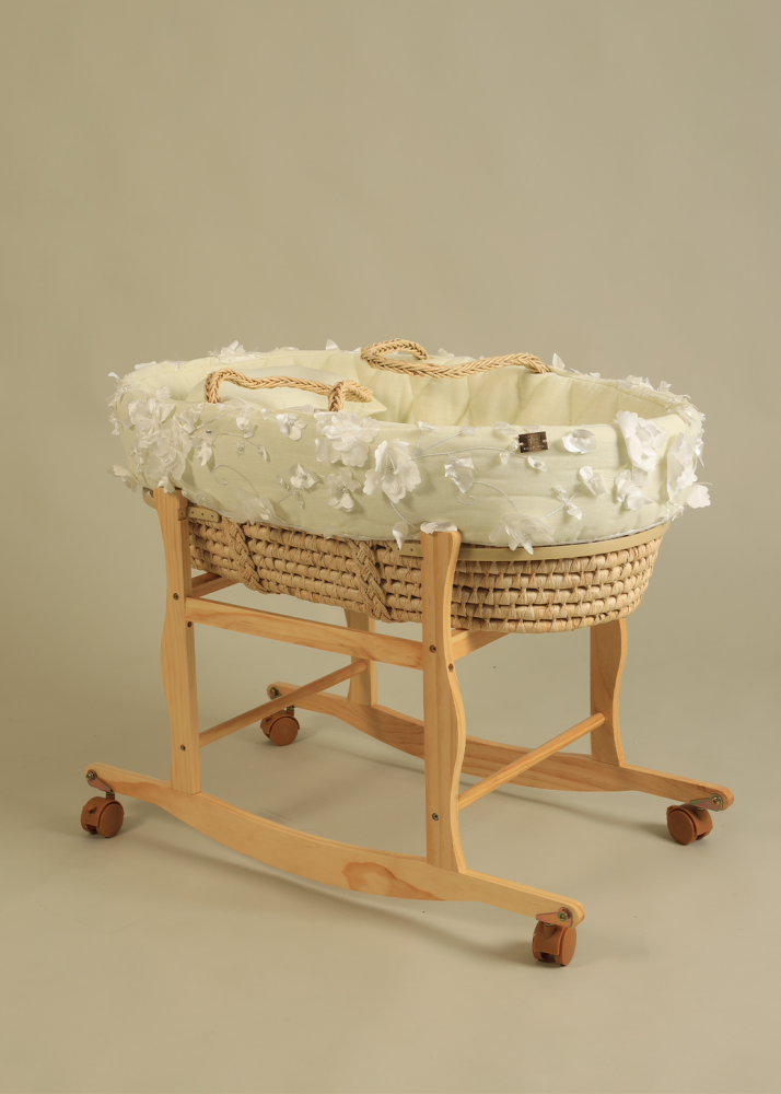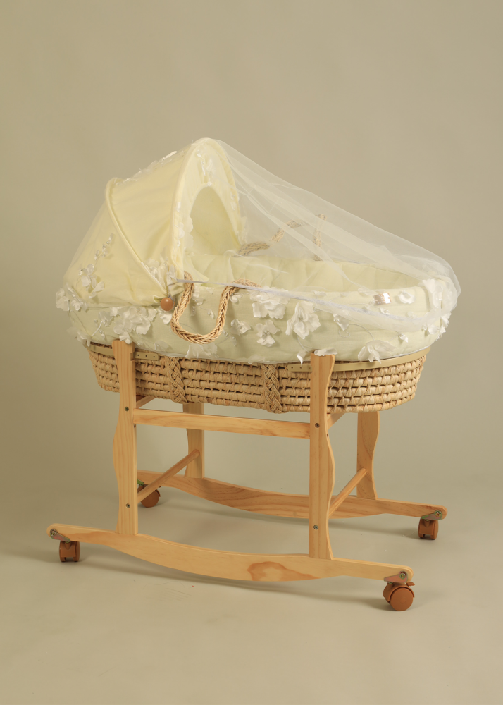 مهد مصنوع من خامة اللينن من اللون الليموني المميز مزين بدانتيل الورود على الأطراف كما انه مزود بحشوه مبطنه ناعمة مع مخدة تمنج طفلك الراحة . بالاضافة الى الهيكل الخشبي .