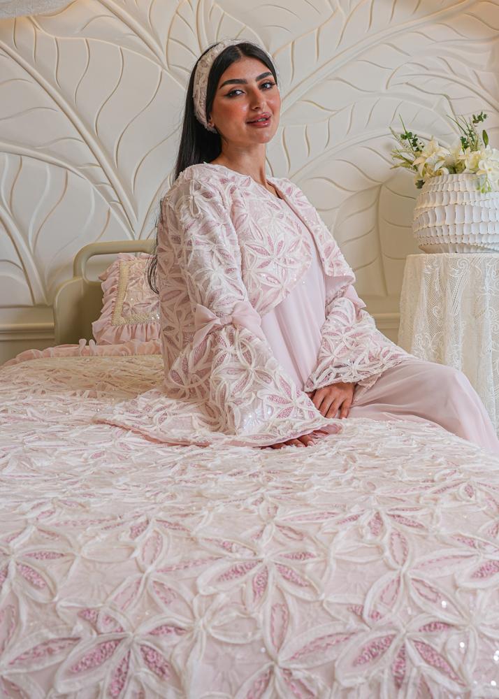 روب استقبال مميز يجمع بين النعومه والجمال بلونه الوردي البارد , ويتميز بتصميمه الفريد بأضافة الدانتيل المورد والأنيق . وتعد هذي القعه من أنسب الخيارات للأستقبال والتميز باطلاله فريدة ومميزة .