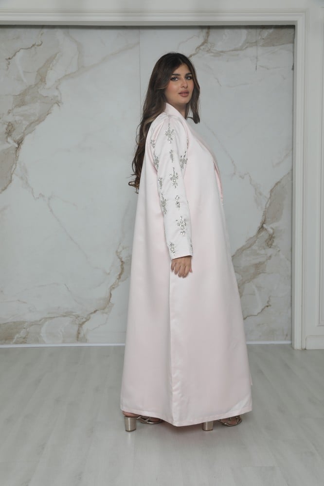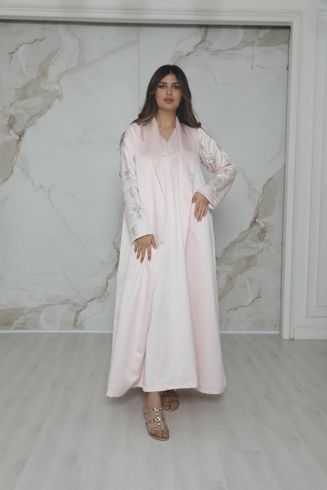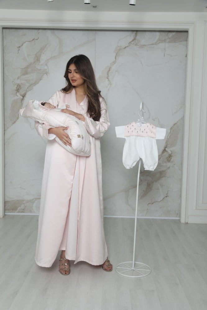 مجموعة استقبال فاخرة من اللون البنك مميزة بالكريستال ( لبس الام + لبس البيبي + المدس )