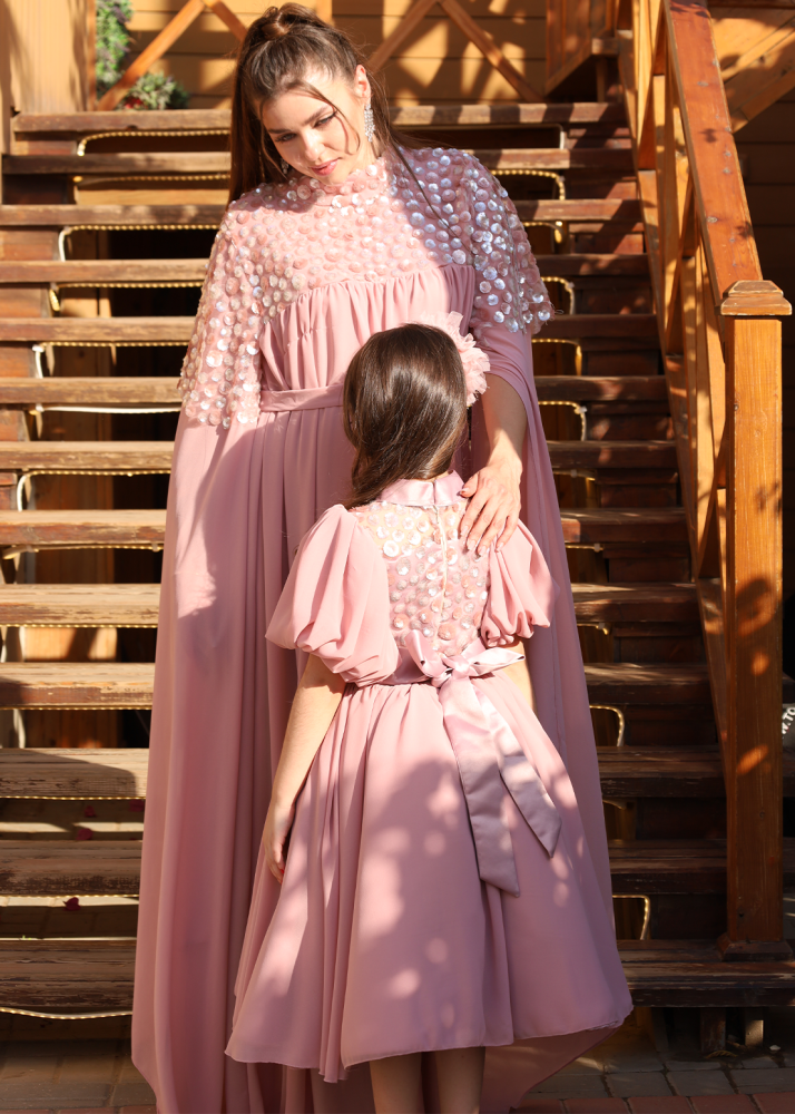 احتفلي بأجمل اللحظات مع طقم "لمسة حب" المصمم خصيصًا للأم والطفلة بإطلالة متطابقة ساحرة. يتميز الفستانان بلون لحمي ناعم وتطريز لامع أنيق يغمر الجزء العلوي، مع قصات مريحة تناسب كل من الأم الحامل والطفلة الصغيرة. القماش الخفيف والتصميم المنسدل يوفران حرية الحركة وأناقة ملفتة في المناسبات الخاصة وجلسات التصوير العائلية.